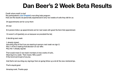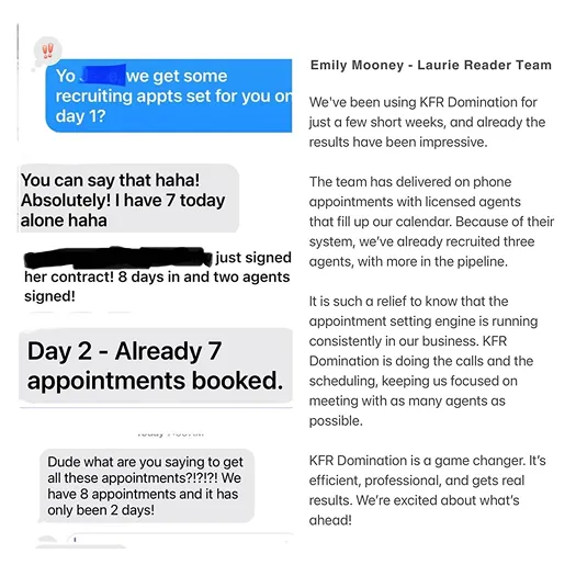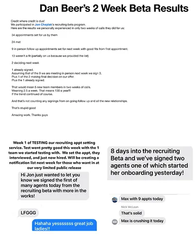 Week 1 - Quick onboarding call to set up your lists and customize your approach. We start making calls within 2 days. You can close your first recruits from the appointments we set.
